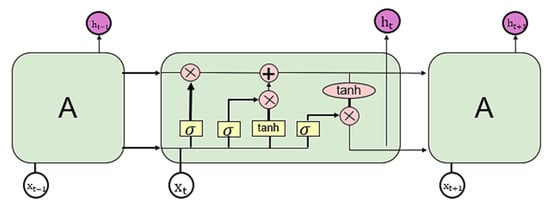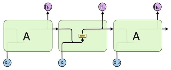 The recurrent neural network (RNN) is composed of repeating neural network modules, each module containing only one tanh layer. It calculates the current output based on the current input and the previous output from the last time step, as shown in Figure 13. The long short-term memory network (LSTM) is a special type of RNN that effectively solves the problem of long-term dependencies []. After improvement, the structure of the LSTM is more flexible and efficient, as shown in Figure 14. The structure of the LSTM is similar to RNN, but the repeating modules are more complex.