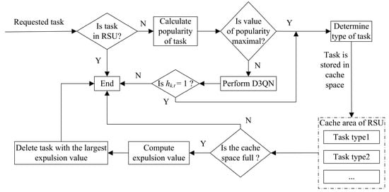 An active cache based on the popularity and a passive cache based on the D3QN are used together; the parallel use of the two caching models enables more tasks to be cached in the RSU, and its calculation result is also retained. If the requested task can match the task in the cache area, the task does not produce any computation and transmission latency and energy consumption; it only generates the transmission latency and energy consumption of the transmission result. With an active cache, the most popular task will be cached in the cache area, and this will reduce the calculation of part of the tasks; however, when the cache area is enough, only caching the most popular task is not enough to maximize the use of the cache area, so a passive cache is proposed, using the caching policy of the D3QN to cache tasks that are not the most popular tasks in order to maximize the use of the cache space.