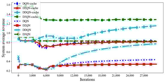 Figure 3 that the average revenue of D3QN−cache in each episode is much higher than that of other DRL algorithms, which means that D3QN−cache can better achieve the goal of maximizing system revenue. This is because in the D3QN, the RL agent uses double frame to observe the changed state of the environment and the reward due to the execution of the action, which makes the Q values more efficient than those of the D2QN, DDQN and DQN. In the D2QN, the RL agent uses the target network to obtain the action values of all actions in the next state, and then calculates the target value based on the optimal action value. Due to its maximization operation, there is an overestimation problem in the algorithm, which affects the accuracy of decision making. In the DDQN, the agent only cares about the action of updating the Q value function. However, the DQN has limited ability within the high-dimensional state and action space, and it is difficult to explore and find the optimal joint offload and cache strategy due to its limited capability within the high-dimensional state and action space. So compared to other DRL algorithms, the agent of the D3QN can find a better joint offload and cache policy than other DRL algorithms in accomplishing tasks. From 0 to 6000 times, the average system revenue of the proposed algorithm tends to decline, which is because the agent is constantly learning, exploring a good strategy and reaches a stable state about 6000 times. It can be seen that, compared with other DRL algorithms, the D3QN can converge quickly and reach a steady state more easily. This is because the passive cache model based on the D3QN is used to cache tasks, which can use the advantage function and target Q value for choosing a suitable strategy to execute the action of caching tasks, with the agent thus being prompted to explore a better strategy and action in order to obtain higher rewards. In order to reduce system latency and energy consumption, some appropriate tasks can be cached in RSUs, which can reduce the number of computation and transmission tasks, thus reducing system costs and improving system revenue. For this reason, the average revenue of a system with a DRL algorithm caching model is much higher than that of a system without a caching model. As can be seen from