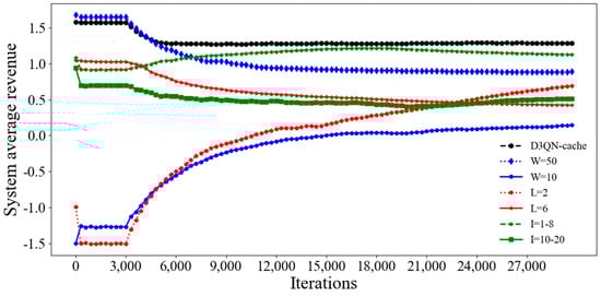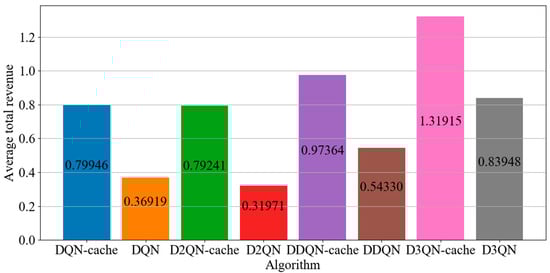 Figure 4, compared with DQN−cache, DDQN−cache, D2QN−cache, DQN, DDQN, D2QN and D3QN, the total average system revenue of D3QN−cache is increased by 65%, 35%, 66%, 257%, 142%, 312% and 57%, respectively. This shows that the proposed algorithm is more effective than other DRL algorithms.