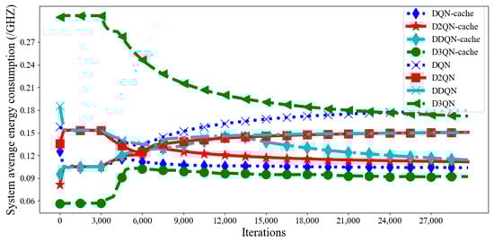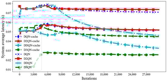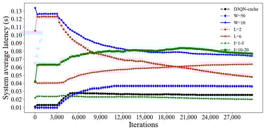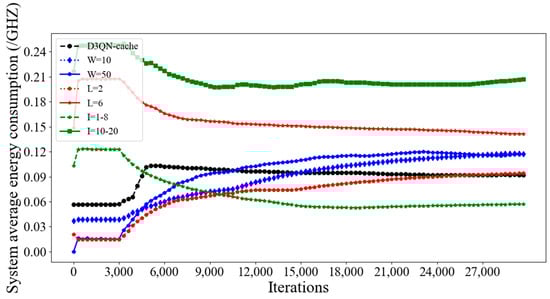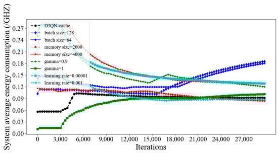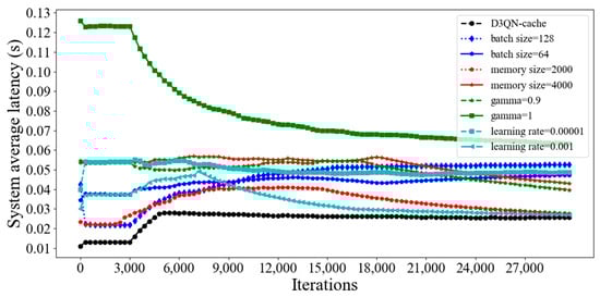 Figure 11, it can be seen that the system average latency of D3QN−cache is much lower than that of other parameters, because a larger batch size can accelerate the convergence speed of the model through a large number of parallel calculations, and the memory size is 3000, which means that the empirical data is not too much or too little, and the agent learns some good behaviors and ignores some bad ones. Additionally, the gamma is set as 0.99, and this can effectively balance the relationship between current rewards and future rewards; furthermore, the learning rate of 0.0001 can quickly find the optimal parameters of the model. Although the average latency of D3QN−cache is the lowest, it does not mean that the energy consumption is the lowest. From