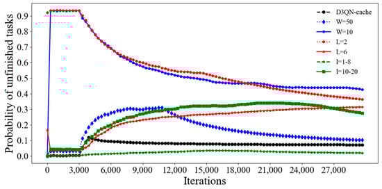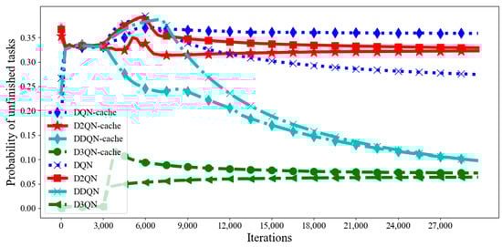 Figure 7, the probability of unfinished tasks with the D3QN algorithm is much lower than that with other algorithms. This is because the D3QN not only uses the effect of the state on the Q value, but also the effect of the action on the Q value. When the task needs to be cached, the state has a great impact on the Q value. This is seen with the popularity of the task, the size of the task and other states having a great impact on the Q value. Additionally, when a task needs to be offloaded, the action has a great impact on the Q value. The choice of which action produces a greater revenue also greatly affects the Q value. Combined with the advantages of both, the performance of the D3QN is improved. In addition, it changes the way that it chooses the target Q value by using the action of the target Q-value, which eliminates overestimation. Compared with the D3QN, although the probability of unfinished tasks with D3QN−cache is higher at the beginning, when the number of iterations increases, the probability of unfinished tasks with D3QN−cache keeps decreasing, because the agent is constantly exploring better actions to complete tasks. However, a lower probability of unfinished tasks with D3QN is at the cost of high latency, high energy consumption and low profit; in our study, the agent of the D3QN chose a high-pay, low-return action to complete the task. Additionally, when the number of iterations increases, the agent in pursuit of a high profit also begins to explore actions that provide low latency and low energy consumption, so the probability of unfinished tasks begins to rise. Therefore, considering the latency, energy consumption, revenue and probability of unfinished tasks, the proposed algorithm is better.