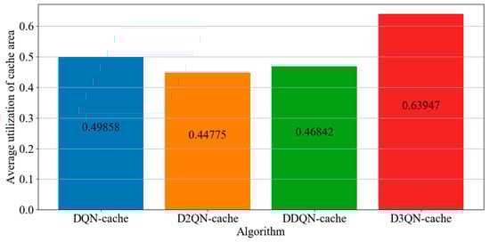 Figure 8, compared with DQN−cache, D2QN−cache and DDQN−cache, D3QN−cache, that is, the proposed algorithm, has the highest average utilization of cache space, with its average utilization being improved by 28%, 42% and 36%. It makes use of two caching models, the active cache and passive cache, and not only caches the most popular tasks, but also uses the D3QN to cache other tasks. The cache difference between these four algorithms is a result of the different DRL algorithms used in the passive cache. In the proposed algorithm, the best action is selected to cache more tasks according to the advantages of the D3QN mentioned above; by doing so, the utilization of the cache space is improved.