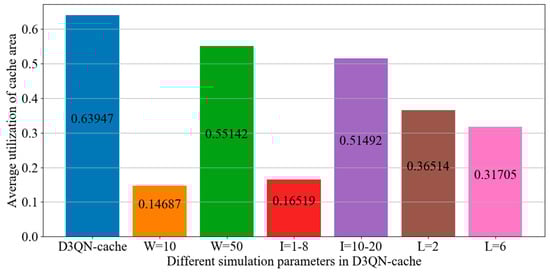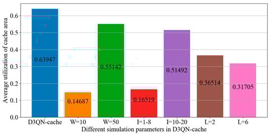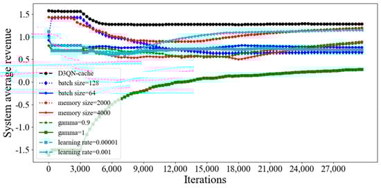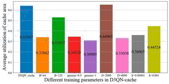 Figure 14, it can be seen that utilization of cache space with a memory size of 2000 exceeds D3QN−cache, which indicates that a memory size of 2000 is the most advantageous for cache decision making. However, we are considering the overall system revenue, so in order to achieve this goal, some cache costs must be sacrificed. The gamma being equal to 1 means that the algorithm lacks convergence ability and the agent will consider possibilities, which will increase complexity. However, when the gamma value is too small, this means that the agent only focuses on current information and has a poor estimation of action. Therefore, it can be seen from