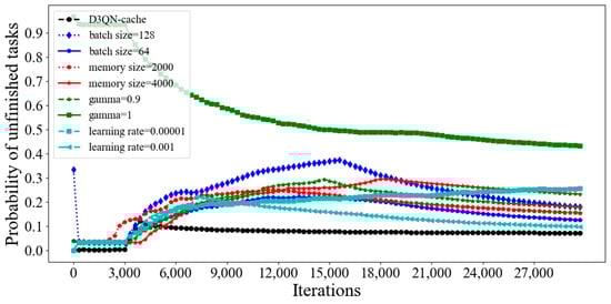 Figure 14 compare the probability of unfinished tasks and utilization of cache space for different training parameters in D3QN−cache, respectively. As the batch size increases, the speed of processing the same amount of data increases, but the number of epochs required to achieve the same accuracy increases. Due to the contradiction between the two factors, the batch size must be increased to a certain value in order to achieve the optimal time. From