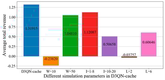 Figure 16, it can be seen that the average revenue for D3QN−cache is the highest for the following reasons. When the number of tasks increases from 10 to 30, the average revenue will greatly increase. This is because there are more tasks to process, which leads to more revenue. However, when the number of tasks increases from 30 to 50, the revenue will decrease. This is because with more tasks, the greater the pressure of the backhaul link and the greater the number of computing resources required. However, the computing resources of SDVs and RSUs are limited and cannot handle a large number of tasks. This will result in a decrease in revenue. When the size of the task decreases from 10–20 KB to 8–10 KB, the average revenue will greatly increase. This is because the larger the size of the task, the greater the number of resources that are required, making it is impossible to calculate and store tasks that are too large. When the size of the task decreased from 8–10 KB to 1–8 KB, the average revenue decreased, but it did not decrease much. This is because the currently designed resources of SDVs and RSUs are suitable for sizes of between 1–10 KB. Since the deletion rule of the task is type deletion, the type of task will affect the cache hit rate of each task. When there are very few types of tasks, each type will contain many tasks, so when performing task deletion, it will cause a large number of tasks to be deleted, resulting in a decrease in the cache hit rate and average revenue. When there are many types of tasks, it indicates that the number of same tasks is very small, and the experience data that the agent can obtain are very small, which can lead to a lower average revenue. Therefore, the average revenue for