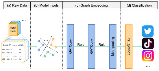 26] built traffic interaction graphs to represent packet-level client–server interactions. However, their work focused on decentralized applications. In their traffic interaction graphs, the nodes represented packet size from a flow, and edges between the nodes were added in the chronological relationships and bursts. They constructed a powerful GNN architecture to classify traffic. To represent a webpage traffic trace, Lu et al. [