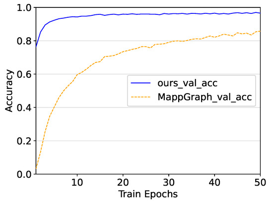 Figure 2, the training speed of our model is extremely fast, converging after 10 epochs. At the same time, its classification performance on the validation set remains high. However, MappGraph consumes a lot of epochs during the training process and cannot reach an acceptable accuracy fast enough. Specifically, the MappGraph model needs to be trained for more than 100 epochs to achieve an accuracy of 0.93, and the model trained for only 10 iterations cannot be used for classification because its accuracy is less than 0.7. In contrast, our model is much faster than MappGraph at obtaining high accuracy, taking only 10 epochs. Moreover, under the same GPU, the training time of the Mappgraph model is a few seconds longer than our model training time per epoch. Therefore, it may not be an appropriate solution for the classification of traffic in real-world scenarios. The reason why MappGraph spends more time on training is that its GNN-based module, consisting of four GNN layers and a global pooling layer, is designed with much more complexity than ours. Each output in its GNN-based module not only passes to the next layer but also to the pooling layer. Conversely, we only designed two layers in the GNN-based module and its transferred value is linear. We also did not add convolutional layers after graph-embedding learning. To detail the amount of computation for both models,