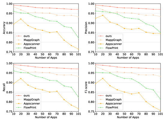 Figure 3, all techniques performed well when the total number of apps was low; however, the performance degrades as the number of apps is increased. It is obvious that the higher the number of apps to be classified, the more difficult it is to classify different apps. This explains why the number of apps in the same category grows with the total number of apps, subsequently leading to more similar traffic being classified. The results indicate that the performance of the other methods, including Appscanner, FlowPrint, and MappGraph, have a dramatic decrease between the smallest and biggest datasets (i.e., 10 apps and 101 apps), while our method maintains high performance in the two scenarios; however, there is inevitably a slight drop of our method in the metrics. Thus, this demonstrates the effectiveness of our method.