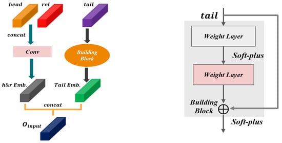 - Tail Entity Embedding: we employ a residual network with a softplus activation function to obtain the embedding vector of the tail entity:where represents the residual network.