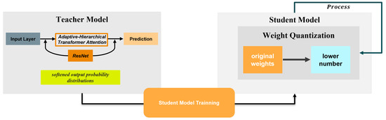 Model compression seeks to decrease the storage and computational demands of deep learning models without compromising their performance. In the proposed approach, we implement a teacher–student model incorporating knowledge distillation and weight quantization methods to achieve effective model compression. A schematic representation of the model compression process, including its key components, can be found in Figure 3. A comprehensive examination of the individual techniques employed is provided in the subsequent sections.
