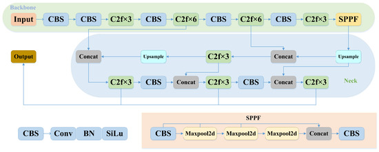 YOLOv8 can support all versions of YOLO and can switch between different versions at will. It can also run on various hardware platforms (CPU-GPU), giving it strong flexibility. The YOLOv8 network architecture diagramias shown in Figure 1. The CBS in Figure 1 is composed of convolution, batch normalization, and SiLu activation functions.