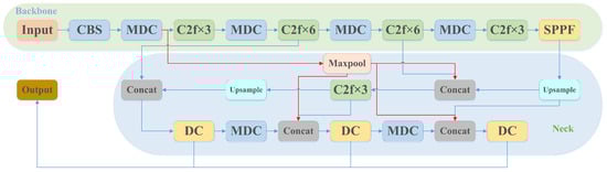 Therefore, this paper first used the convolution of size 1 × 1 for dimensionality reduction and then used the convolution of size 3 × 3 for downsampling, which reduced a lot of calculation. During this operation, the Maxpool layer and depth-wise separable convolution were concatenated. This can fully supplement the information lost in the downsampling process of each item, and can more completely preserve the context information during feature extraction. After many experiments, it was proved that the MDC module was more efficient than the downsampling method of YOLOv8 original. The specific structure is shown in the Figure 2.