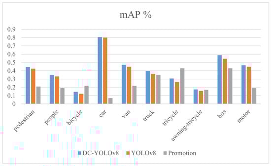 In order to compare the detection effect of different types of objects in the DC-YOLOv8 algorithm, we recorded the mAP of 10 kinds of objects in the Visdrone dataset, and the specific results are shown in Figure 6. From the results, we can see that there are four categories in which the recognition accuracy is higher than the average level of the whole dataset. The modified algorithm shows steady improvement with larger objects such as cars and great improvement with smaller objects such as tricycles, bicycles, awning-tricycles, etc.