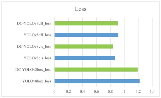 The reasons why the DC-YOLOv8 algorithm performs better than other algorithms were analyzed: (a) Most of the feature fusion methods used by classical algorithms are FPN + PAN, and small-size targets are easy to be misled by normal-size targets when extracting features layer by layer, resulting in loss of most information. The feature fusion method of DC-YOLOv8 fuses shallow information in the final information result well and effectively avoids the problem of information loss in shallow layers. (b) Unimportant information will be automatically ignored in feature extraction, and small-size target pixels will be ignored when extracting features, resulting in reduced accuracy. However, DC-YOLOv8 adopts the ideas of DenseNet and VOVNet, which use deeper networks and are able to learn more detailed information. The class loss of DC-YOLOv8 and YOLOv8 is shown in Figure 7. We could see from the Figure 7 that DC-YOLOv8 had a certain degree of reduction in three category losses: box loss, class loss, and dfl loss.