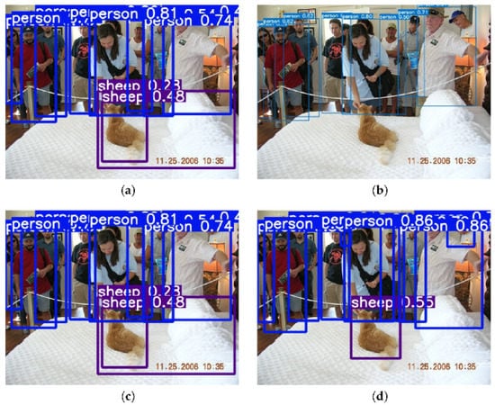 For the second set of comparison experiments, images in the PASCALVOC2007 dataset with overlap between multiple people were selected. Figure 9 shows that two people overlap in front of the middle door, and we can only see the head of the person behind due to occlusion from the person in front. In this case, the YOLOv8 detector failed to detect the person behind, with only their head visible. At the position of the cat, there was a false detection (detecting the human arm as a cat) because the color of the human arm is similar to that of a cat. In the case of severe overlap on the rightmost side, YOLOv8 did not detect the person behind. In contrast, in the case of overlap, DC-YOLOv8 accurately detected the person near the door and the person to the far right, and there was no false detection due to similar colors. It can be seen from Figure 9 that DC-YOLOv8 also outperforms YOLOv8 in the detection of normal-sized objects.