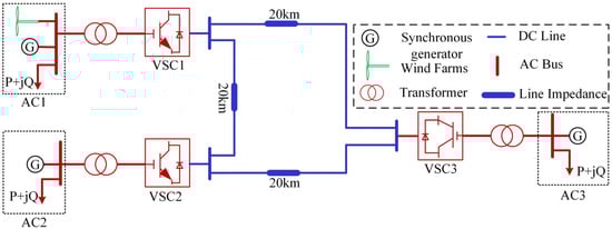 Multi-terminal DC transmission technology is based on two-terminal DC transmission and typically consists of three or more VSC stations. If one VSC station is decommissioned, power can still be transferred between the remaining VSC stations and can be used to interconnect AC networks and transport power. A three-terminal VSC-MTDC system architecture is shown in Figure 1, where the DC side of VSC1–VSC3 is connected in parallel through the DC network. AC1–AC3 is the active AC system, and P + jQ is the AC side load.