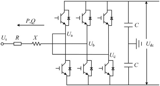 The structure of the VSC is shown in Figure 2. Us is the AC side voltage; Ua, Ub and Uc are the three-phase voltages on the AC side of the VSC, respectively; R and X are the equivalent resistance and reactance on the AC side of the VSC, respectively; C is the DC side capacitor; and Udc is the DC side voltage.