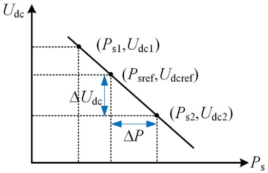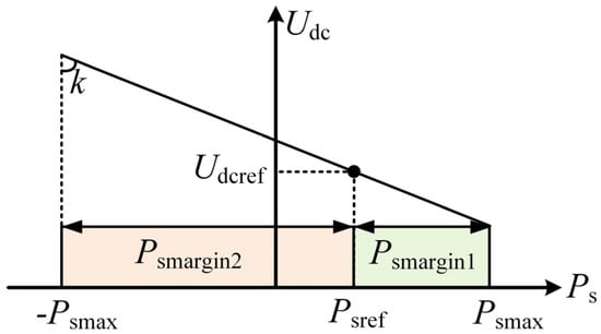 As shown in Figure 7, when Ps is greater than 0 and moves to the right, Psmargin1 is gradually decreasing, while Psmargin2 is gradually increasing. In other words, there is a power margin when the VSC station moves toward the maximum power point [,]. Therefore, the power margin Psmargin1 needs to be considered when dynamically correcting the droop coefficient. Instead, the focus is on the power margin Psmargin2. Therefore, in order to make better use of the power support capability of each AC system, the power output of the converter station with a larger power margin can be increased, the power output of the converter station with a smaller power margin can be reduced, and the DC voltage deviation can be further reduced.