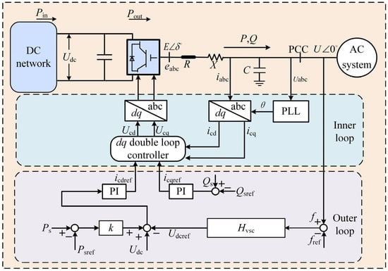 In Figure 6, the outer-loop and inner-loop control are the main components of the overall system control. The outer loop mainly controls the active power and DC voltage of the AC system, tracking the controlled variable to the reference value, while using the output signal as the reference signal for the inner-loop current control. The inner-loop controller tracks the current setpoint of the outer-loop output by the PI control to achieve non-differential current control, and converts the current signal to a voltage signal to generate PWM pulses to control the shutdown of the devices in the VSC, thus achieving system tidal voltage control. From the outer-loop control, the principle of virtual inertia control is that inertia is created only by varying the DC voltage, which is acted upon by the control system to produce a change in DC voltage. The inertial power consists of two parts: one part is the energy storage of the DC capacitor of the VSC station and the other part is the power support of the other VSC stations of the DC system; this is analyzed in detail below.