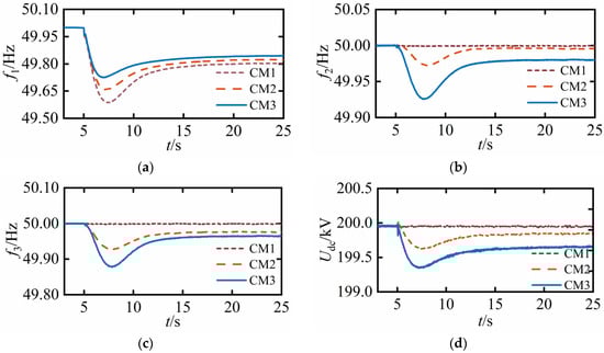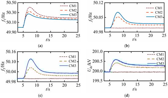Let Δf1–Δf3 be the change in frequency of AC1–AC3, respectively, and ΔUdc be the change in DC voltage. As shown in Figure 9, the AC1 system frequency increased as the load increased. When CM1 was used, the VSC-MTDC system was unable to respond to the load fluctuation on the AC side, resulting in a large frequency fluctuation in the AC1 system; Δf1 was 0.41Hz, while Δf2 and Δf3 were both 0. When CM2 was used, the VSC station released the energy of the DC capacitor through the virtual inertia control to reduce the frequency deviation. At the same time, the reasonable distribution of the injected power of the VSC station can contribute to the rapid recovery of the AC1 system frequency; Δf1, Δf2 and Δf3 were 0.34 Hz, 0.03 Hz and 0.07 Hz, respectively. However, as the virtual inertia coefficient is fixed, the ability of the DC side to participate in frequency regulation was limited.