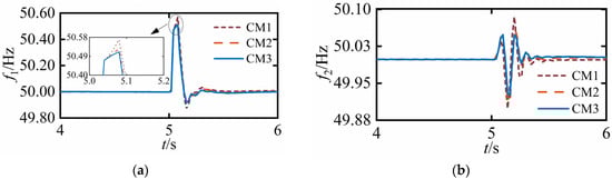 As can be seen from Figure 11, after the fault of AC1, the grid frequency changed instantaneously, and then the frequency gradually returned to the rated value. When AC1 failed, the frequency fluctuation under CM3 was the smallest, CM2 was the second most effective and CM1 was the least effective; under CM3, Δf1, Δf2 and Δf3 were 0.57 Hz, 0.53 Hz and 0.51 Hz, respectively. When adopting the control strategy proposed by this paper, the DC voltage under transient fault can be reduced to a certain extent, which is conducive to the stability of DC voltage during fault recovery. At the same time, in the frequency recovery process, the recovery time under CM3 was short, the oscillation was small, and the frequency was more stable. The above simulation results illustrate that CM3 control facilitates frequency and DC voltage stability during transient fault recovery.