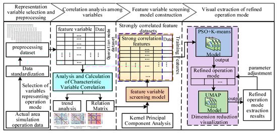 This study is organized as follows: In Section 2, the visual extraction process of the fine operation mode of the new power system will be introduced. Section 3 proposes a new type of power system operation mode representation variable selection and operation data preprocessing algorithm. Section 4 constructs the feature variable screening model. Section 5 introduces the fine-grained operation mode visualization extraction algorithm. Section 6 experimentally analyzes the law of refined operation mode in the new power system. Section 7 summarizes the study.
