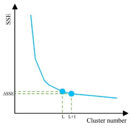 where represents the number of clusters; represents the set of the -th type of operation mode; and represents the cluster center of the -th type of operation mode. With the increase in the number of clusters , the aggregation degree of each type of operation mode gradually increases, and its value decreases accordingly. When the decline of tends to be smooth, it is considered that the value of at this time is the number of clusters that can achieve the desired effect, as shown in Figure 3.