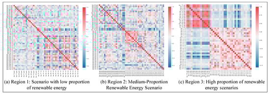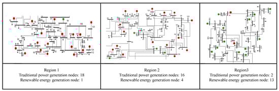 In this paper, a provincial-level SG126 node in China is used as the network frame, and the proposed method is used to extract and display the refined operation mode under the new power system. As shown in Figure 4, the topological map of the power grid is divided into three regions according to the penetration rate of renewable energy in the region: low proportion, medium proportion, and high proportion (among them, the red elements represent traditional power generation nodes, and the green elements represent renewable energy power generation nodes). These regions correspond to different forms of power grids in different periods. The analysis and comparison of the three regions are carried out, and the obtained results are applicable to the actual power system.