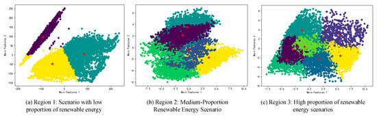 The change in the operation mode of the power system can be expressed as the change of the operation law of the active power and reactive power of all nodes, line flow, voltage amplitude, phase angle, and other related electrical state quantities under a given operating state of the power grid []. The cluster-based extraction method can categorize the operating data into different groups according to the different values of the electrical quantity data and ensure that the data in the same category have great similarity []. In this section, the extraction of refined operation modes is achieved by utilizing the selected strongly correlated feature variables, combined with the method of unsupervised clustering. In addition, the extracted operation modes are visualized in two dimensions to observe the output characteristics of each variable in different operation modes.