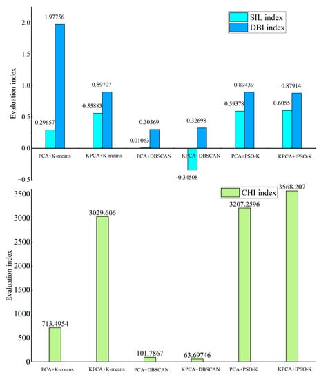 Figure 11 compares the operation mode extraction method proposed in this paper with several other extraction methods using the scores of the Silhouette Index (SIL), the Davies–Bouldin Index (DBI), and the Calinski–Harabasz Index (CHI) as clustering evaluation indicators [].