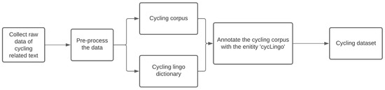 The data collection process consists of two parts, one for the cycling-related corpus and the other for our custom NER tool, which needs annotated data from the cycling lingo context to learn how to detect cycling lingo as an entity. We gathered the cycling-related corpus by scraping several online sources, including https://en.wikipedia.org/wiki/List_of_bicycle_parts (accessed 8 January 2023), https://www.bicycling.com/ (accessed on 10 January 2023), https://www.parktool.com/ (accessed on 10 January 2023), and https://www.velominati.com/ (accessed on 10 January 2023). We decided to collect our data from these specific online sites because they have articles that are highly focused on bicycle parts, thus allowing us to obtain a highly relevant pool of information for our dataset. For example, Park Tool is an American company producing bicycle-specific tools for repair and maintenance. They have an extensive collection of publicly available articles for maintenance and repair. The overall raw text file contains 146,231 rows of various lengths, and to pre-process them, we loaded all raw data into a panda data frame. We counted each row for characters and excluded sentences with fewer than 200 characters, allowing us to have some context available in the sentences, as short sentences were not of value to us. After removing duplicates, we had 74,268 rows in our data frame. Then, we cleaned the data by removing all in-text citation numbers and reference symbols. Because we want to ensure that each row contains a single sentence for annotation purposes, we used the function sent in the spaCy library to split rows into sentences. Finally, the collected raw data of the cycling corpus were pre-processed and ready for annotation. Because of the large size of the corpus to be labeled, we created a Python script for annotation, which looped through every sentence in our sentence dataset and identified the words in our cycling lingo dictionary. However, we note that each word in our cycling lingo dictionary may appear in different casing, such as uppercase or lowercase, and could also have different suffixes due to the plural form. Thus, we accounted for each of those cases to make the annotation quality as good as possible.
