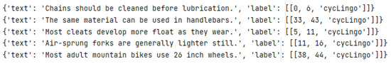 Annotating single words from the lingo dictionary was straightforward; however, several words in cycling lingo consist of more than one word separated by space, such as bottom bracket, brake lever, and inner tube. To capture the different forms of a word, for example, the plural, we converted the word to its lemma before matching. We used the Python library “re” and its function “finditter” to find all matches of a word in the sentence to the lingo list. Furthermore, we identified the location of a word within a sentence by using the start function of “finditter”. The position of the word was captured by adding the start index of the word in the sentence together with the length of the word, which together pin-points the end of the word. Figure 5 shows examples of the annotated sentences generated by the proposed data generation process. For each sentence, we identify the cycling lingo and its position in the sentence.