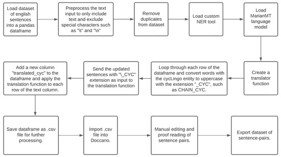 The Norwegian translation of bicycle terminologies can be accomplished in two ways. The first way is to translate the identified cycling lingo word by word and then employ an MT model to translate the rest of the sentences. This process allows complete control and the consistent translation of ambiguous words. In addition, this approach is fast, as it avoids translating every sentence from scratch. However, the word-by-word translation approach has its challenges. For example, by masking the words for translation, the model loses information and produces outputs that might be grammatically inaccurate. On the other hand, we obtain a more grammatically correct translation by training the language model with a domain-specific sentence-pair dataset. In this work, we employed the trained custom NER model discussed in Section 3.2.1 to create such a sentence-pair dataset. Figure 6 illustrates the steps to generate the sentence-pair dataset using our custom NER. We focused on ambiguous words in cycling terms, such as hub, spoke, nipple, housing, and bottom bracket. We translated one thousand sentences manually to create our sentence-pair dataset. We proofread and edited every sentence to obtain the best-quality translation. The dataset was then randomly shuffled and split into 80% training, 10% validation, and 10% test sets for learning the NMT model. There are very few models that are able to translate text from English to Norwegian that we could adapt for our work. These include the Marian translation model (MarianMT) [27] and Many-to-Many (M2M) multilingual translation model developed by Facebook researchers [30]. The MarianMT model is known to perform well in translating generic texts from English to Norwegian. It uses the transformer architecture shown in Figure 2, which has six decoder layers and six encoder layers in the encoder and decoder, respectively, with sixteen attention heads. The model is pre-trained with the OPUS corpora, consisting of over 74 million English and Norwegian sentence pairs [31]. Other popular multi-language models, such as Multilingual Denoising Pre-training for Neural Machine Translation (mBART) [32], do not cover Norwegian. In addition, the Multilingual Text-to-Text Transfer Transformer (MT5) from Google [33] is not pre-trained on a Norwegian corpus, so it would require retraining from scratch for our translations. To develop our NMT model, we performed a preliminary selection test using M2M and MarianMT to translate some of the texts in our dataset. MarianMT outperformed the M2M model with an average SacreBleu score of 41.511 against the 24.497 obtained by the M2M model. The pre-trained MarianMT model performed well on generic text but needed domain-specific terminology improvement to apply to our purposes. Additionally, we chose to use the pre-trained model because it would reduce computation costs by allowing us to use a state-of-the-art model without having to train it from scratch [34]. Thus, we fine-tuned it using our custom sentence-pair dataset. To fine-tune the MarianMt model, we followed the same fine-tuning procedure in the Transformers library using the default training parameters accordingly (https://huggingface.co/docs/transformers/training) (accessed on 2 February 2023).