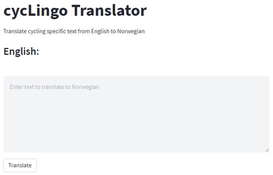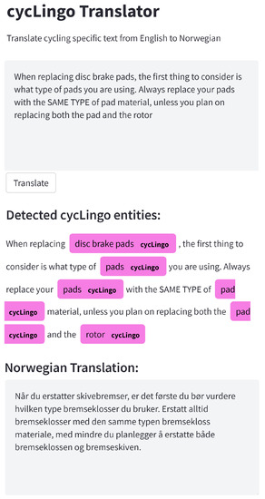 One of the main objectives of our research was to create a prototype software tool to translate text, including bicycle-specific terminology, from English to Norwegian. So far, we have developed our dataset to train a custom NER model, then used this model to create a sentence-pair dataset, and finally fine-tuned a language model on our custom dataset. To tie all parts together, we built a user-friendly web application of the language-translation tool using the Python Dash library, which is built on top of the Flask library. The web application has an input text field, a translation button, and an output text field. The application loads our trained NMT model and our custom NER model. The user can input English text, and the application will return the detected cycling lingo words, including a Norwegian translation. Figure 7 shows the user interface of the developed web application for our proposed machine translation of bicycle-specific terminology from English to Norwegian, including generic. The complete code for the developed language models is available at our GitHub repository (https://github.com/danielhellebust/cycLingo), while the web application is hosted on our Huggingface hub (https://huggingface.co/spaces/DanielHellebust/cycLingoTranslator).