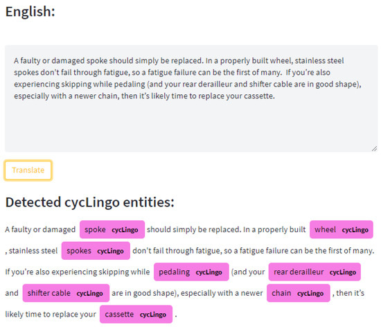 Figure 8 shows a sample of the qualitative outputs of the custom NER model. The NER model correctly identified all the cycling lingo entities in the English texts, including capturing noun chunk entities such as “shifter cable” and “rear derailleur”, which are challenging to detect because they consist of two tokens. Thanks to the quality of the generated dataset and the learned custom NER model, the accurate detection of cycling lingo entities in a sentence allows direct word-by-word translation using a custom dictionary. We also evaluated the performance of the custom NER model by computing the F1 score of its outputs using the spaCy library. Our custom NER model achieved, on average, an F1 score of 88.91% in detecting the cycling lingo words in the test set.