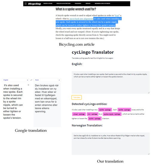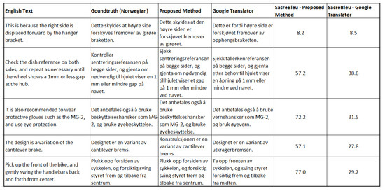We compared the performance of the proposed method with the classic Google Translate. Figure 10 shows the SacreBleu scores for both approaches on some test samples. In general, our model outperformed Google Translate on the entire test set, with an average SacreBleu score of 45.099 against 36.615 for Google Translate. Figure 11 shows the outputs of Google Translate and our proposed method on the same bicycle-related article from the internet. Google Translate translated the text shown in Figure 11-top as Den brukes også når du installerer en ny eiker. Hver eike er festet til hjul felgen med en eike nippel, som kan snus for å enten stramme eller løsne eikens spenning. (see Figure 11-bottom left). In contrast, our proposed model translated the text as Det brukes også når du installerer en ny eike. Hver eike er festet til hjul felgen med en eike nippel, som kan dreies for enten å stramme eller løsne eikens spenning. (see Figure 11-bottom right). Notably, Norwegian grammar is better with our model than with the Google Translate app. The proposed NMT model also translates “turned” to “dreies”, which is more appropriate in this context than Google’s translation of “snus”.