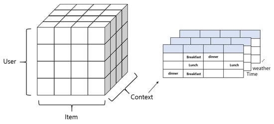Among them, context-aware recommender systems are based on the assumption that users have different preferences depending on their context []. The contextual information required for context-aware recommender systems can be collected through the user’s smartphone or IoT (Internet of Things). Contextual information is mainly used for time, weather, and location, and depending on the recommended content, traffic conditions, and partner information are also used.