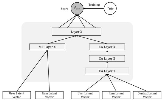 In Figure 5, the MF layer represents the model that considers preference changes in Section 3.1, and the CA layer represents the context-aware recommendation model in Section 3.2. The details of each model are described above. The output from each model is concatenated to get the final prediction.