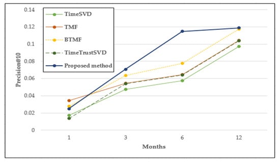 First, the Precision results were examined by the DRS over different periods, and the results are shown in Figure 6. For the experiment, we set the time period to 1 month, 3 months, 6 months, and 12 months. One month was too small a number of data to identify patterns in the data, so we set the time period to six months, which showed some performance. When we split the data into small chunks of time, the accuracy was low due to data sparsity. However, we can see that the performance gradually improves as we capture preference changes from long-term data.