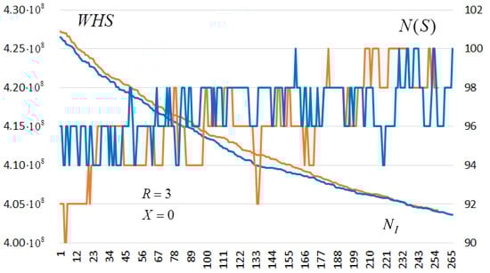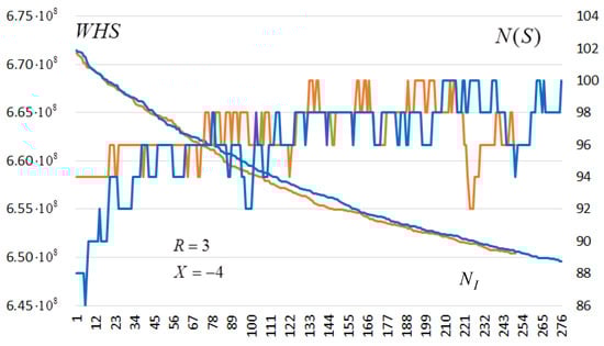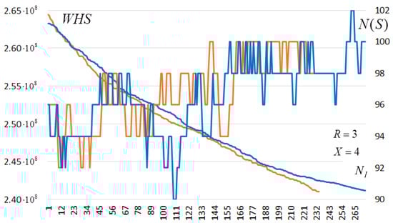 We conducted several trial runs of the algorithm with different WHS parameters. In particular, for the entire range of parameters and from [] we have never been able to form the target S-box with . At the same time, S-boxes with are formed fairly quickly. Examples of changes (tracks) of nonlinearity and values of cost functions for different values of the WHS parameters are shown in Figure 2, Figure 3 and Figure 4:
