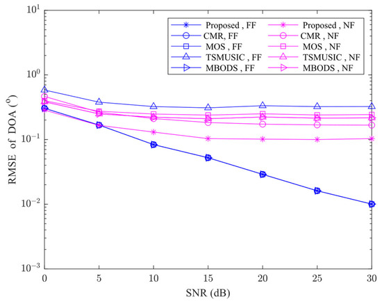 In the first simulation, the effect of changing the signal-to-noise ratio (SNR) on the estimation performance of each method in the scenario of mixed sources was assessed. Two sources were set up, one each for the FFS and the NFS. The incidence angle of the FFS was 50°. The incidence angle of the NFS was 15°, and the range was 2 λ. The snapshot number N was fixed at 400. The SNR varied from 0 to 30 dB, and 500 independent experiments were conducted at 5 dB intervals. Figure 1 and Figure 2 display the variation of SNR with the RMSE of estimated performance for the mixed source DOA and NFS ranges, respectively. As seen in Figure 1, the estimation capability of the proposed algorithm for the DOA of FFS was equivalent to that of MBODS, CMR, and MOS. The reason is that they all first use a MUSIC search to estimate the FFS DOA. Their precision is significantly greater than that of TSMUSIC. Furthermore, the RMSE of the NFS DOA estimation with the presented algorithm is smaller than other compared algorithms. Although the proposed algorithm and the CMR method both use the ESPRIT-like algorithm to estimate the DOA of NFS, they adopt different methods to separate NFS and FFS. According to the experiments, the proposed algorithm uses oblique projection, which is more effective than the matrix difference technique in the CMR method. As seen in Figure 2, the presented method also outperformed the other algorithms in estimating the range of NFS. Although MBODS, MOS, and CMR all obtain range estimation by spectral peak search, the performance of the presented method in estimating the DOA of NFS is superior, so the method is more advantageous for subsequent range estimation.