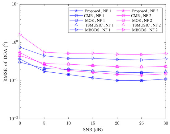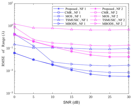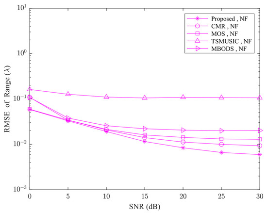 In the third experiment, we analyzed the effect of varying SNR on estimating localization parameters with each algorithm in the pure NFS scenario. Two NFSs were assumed to be incidental to the array. The angle of the first NFS was 10°, and its range was 2λ. The angle of the second NFS was 45°, and its range was 3.5 λ. The snapshot number N was fixed at 400. The SNR was changed from 0 to 30 dB, and 500 independent simulations were conducted at 5 dB intervals. Figure 5 and Figure 6 show the RMSE of estimation performance with varying SNR for the DOA and the range of pure NFSs, respectively. As shown in Figure 5, the performance variation curves of the presented algorithm and the CMR algorithm are equivalent. Because both algorithms use the ESPRIT-like algorithm for NFS DOA estimation and the received array sources are pure NFSs, the previous steps of the algorithm process are invalid. In addition, the variation curves of MOS and MBODS overlap because both use the high-order MUSIC method. From Figure 6, we can see that both the proposed algorithm and CMR are more advantageous at a high SNR and estimate the range parameter of the NFS more accurately.