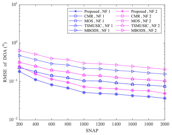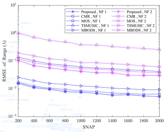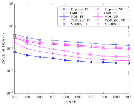 In the fourth experiment, we assessed the effect of changing the snapshot number on the estimation performance of each method in the pure NFS scenario. The source setting was identical to that of the third simulation. The SNR was fixed at 15 dB. The snapshot number was changed from 200 to 2000, and 500 independent experiments were conducted at intervals of 200 snapshots. Figure 7 and Figure 8 show the estimated performance of the RMSE with the varying snapshot numbers for the DOA and the range of pure NFSs, respectively. Figure 7 shows that the presented algorithm and CMR had better performance in NFS DOA estimation with the 2000 snapshot. According to Figure 8, the proposed algorithm and CMR have similar performance to MOS and outperform the other algorithms.