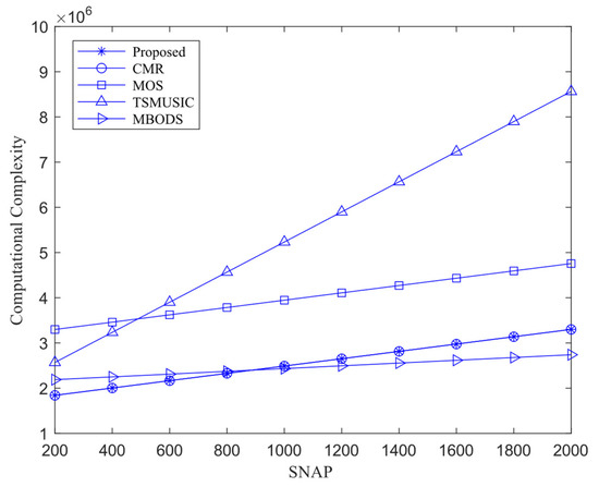 In the fifth simulation, the computational complexity of each method for different numbers of snapshots was verified. The experimental configuration was the same as in the second simulation. The angle search interval was 0.01°, and the range search interval was 0.01 λ. Figure 9 illustrates the variation in computational complexity of each algorithm with snapshot numbers. As shown in Figure 9, the presented algorithm and CMR have comparable computational complexity, which is similar to the MBODS algorithm, and they outperform MOS and TSMUSIC. The computational complexity of TSMUIC is too high with a high snapshot number.