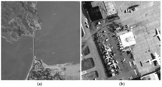 Meanwhile, for QS = 10, the MSE is about 7.5 and is already noticeably less than (8.33), and for QS = 20 this difference further increases (as 400/12 ≈ 33.33). Moreover, the true MSE becomes quite different for the considered test images. A quite thorough analysis of the observed tendencies and the reasons for them has been carried out in [24]. Further, some interesting dependencies from this paper are presented, considering two noise-free images and one noisy image. The noise-free images are “Frisco” and “Airfield”, presented in Figure 3a,b, respectively. As one can see, the image “Frisco” contains many quasi-homogeneous regions, and, thus, it can be treated as simple structure one. Moreover, “Airfield” is approximately of the same complexity as the test images in Figure 2. The third considered image is the same test image “Frisco_std5” but with the artificially generated additive white Gaussian noise (AWGN) with zero mean and noise variance equal to 25. The purpose for considering such an image was to analyze the noise influence on compression characteristics.