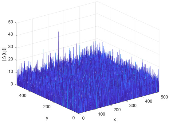 One example of has been determined for the test image Fr01 compressed by AGU with QS = 20. The fluctuations (distortions) can be hardly noticed in the compressed image since PSNR is about the distortion visibility threshold (slightly smaller than 35 dB). Therefore, the 3D plot of the absolute values of differences is presented in Figure 6 instead of the difference image for better visualization. The visualized distortions are absolutely not seen for QS = 5 and QS = 10. Because of this, the difference images are not shown here.