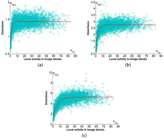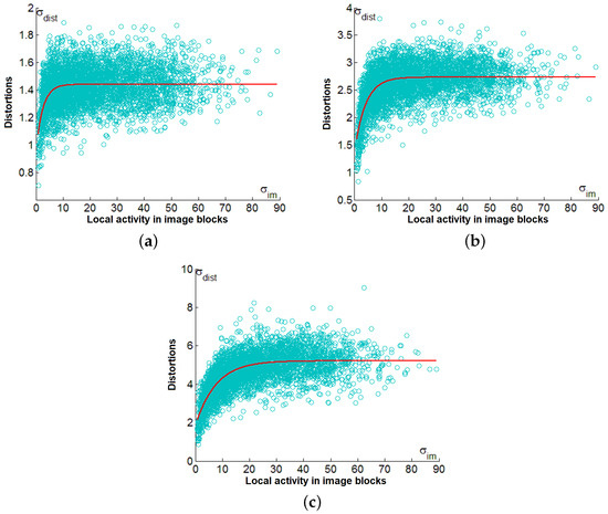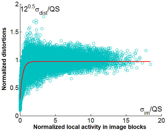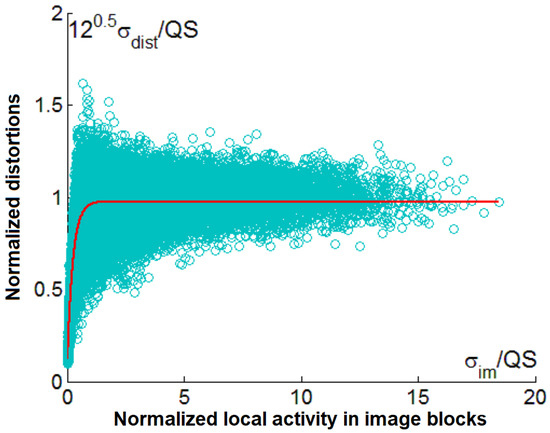 The presented scatter plots explain why the MSE of distortions introduced by lossy compression into simple-structure images differs from the MSE of introduced distortions for complex-structure images. Complex-structure images mostly have blocks where is large enough due to high local activity, and then for such blocks is, on average, approximately equal to . Then, the MSE for the entire image is close to as well. Meanwhile, when QS increases, there are fewer blocks in the saturation area, and the MSE for the entire image is smaller than .