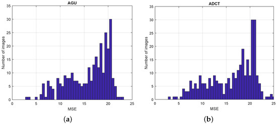 Histograms of the provided MSE values obtained for 300 images from TAMPERE17 dataset: (a) using AGU coder, (b) using ADCT coder.