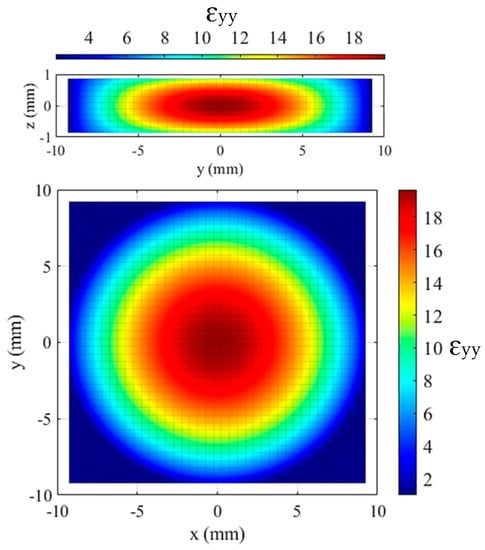 In our case, for a flat Luneburg lens with radius R = 9.5 mm and compressed thickness 2δ = 1.92 mm, the permittivity distribution for εyy was calculated as shown in Figure 2. It can be seen that permittivity varies from 2 to 20.